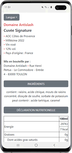 Il est devenu obligatoire d'afficher la fiche nutritionnelle et liste des ingrédients sur l'étiquette de vos vins. Vous avez la possibilité de le faire via un qr-code imprimé sur la contre-étiquette qui mènera le consommateur vers ces informations.